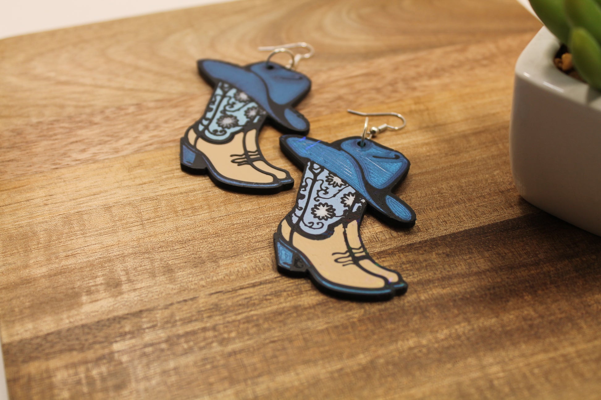 Embrace your inner cowgirl with these Cowboy Boots and Hat Earrings featuring a stylish cowboy boot and hat design. These lightweight, 3D-printed earrings are perfect for adding a playful, rustic flair to any outfit. With a colorful, intricate boot pattern and a soft beige cowboy hat, these earrings combine a bold and fun look with a touch of vintage Western elegance.